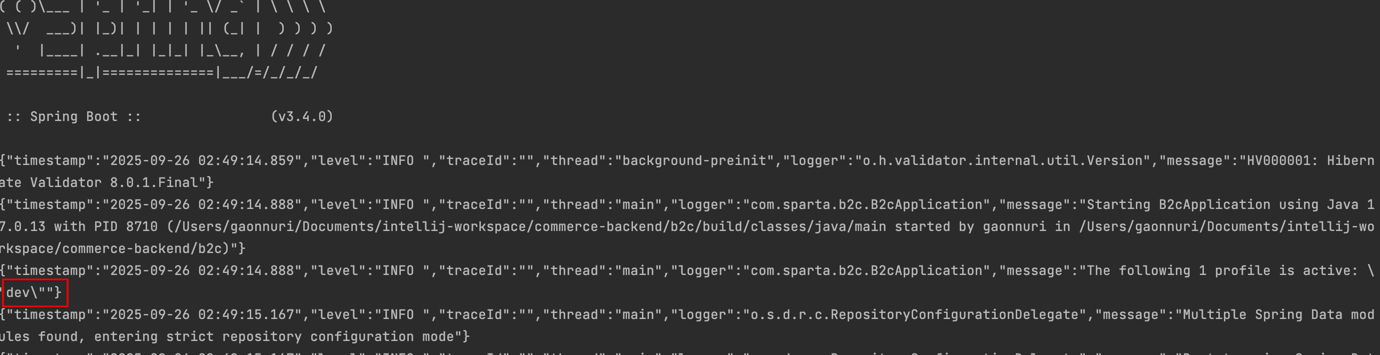 설정 한 내용을 토대로 애플리케이션을 실행해보면 아래 로그와 같이 dev 프로파일이 실행된 것을 볼 수 있습니다.
