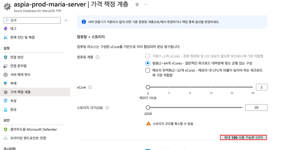 한 가지 제약사항이 있다면 Azure MariaDB의 경우 IOPS만 Scale Up이 불가하며, 스토리지 용량도 함께 Scale Up 해야 합니다. 하지만 일단 한번 Scale Up 하게 되면 Scale Down 은 불가합니다.