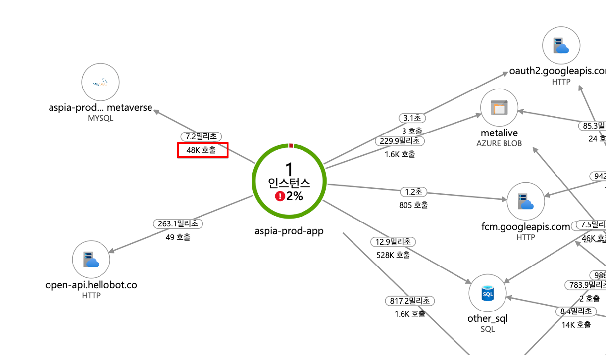 해당 메트릭 정보를 토대로 App Service에서 Output 되는 다량의 데이터들이 어디로 가는지 파악해야 할 필요가 있었습니다. Application Insight 맵을 통해 서비스 부하 기간 동안 App Service에서 DB로 48,000건 호출됨을 확인할 수 있었습니다. 즉, 대부분의 통신이 DB와 이루어진 것 입니다.