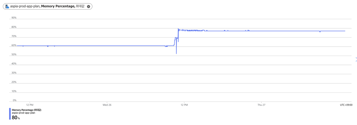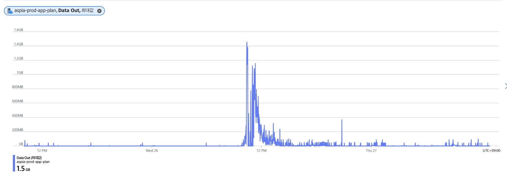 App Service 메트릭 정보를 통해 CPU, Memory 부하도 높지만 Data Out이 최대 1.5GB가 발생했음을 확인했습니다.